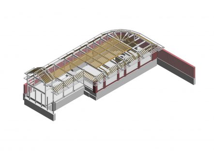 We designed a new swimming pool and gym as an extension to an existing large house. The pool structure was reinforced concrete and included curved pool walls and foundation for the roof. The roof was timber supported on a steel portal frame to provide clear spans over the whole area and to avoid any bracing in the glazed elevations. The coordination of the details of the structure was aided by modelling the building in Revit allowing 3D views to be created as necessary.
